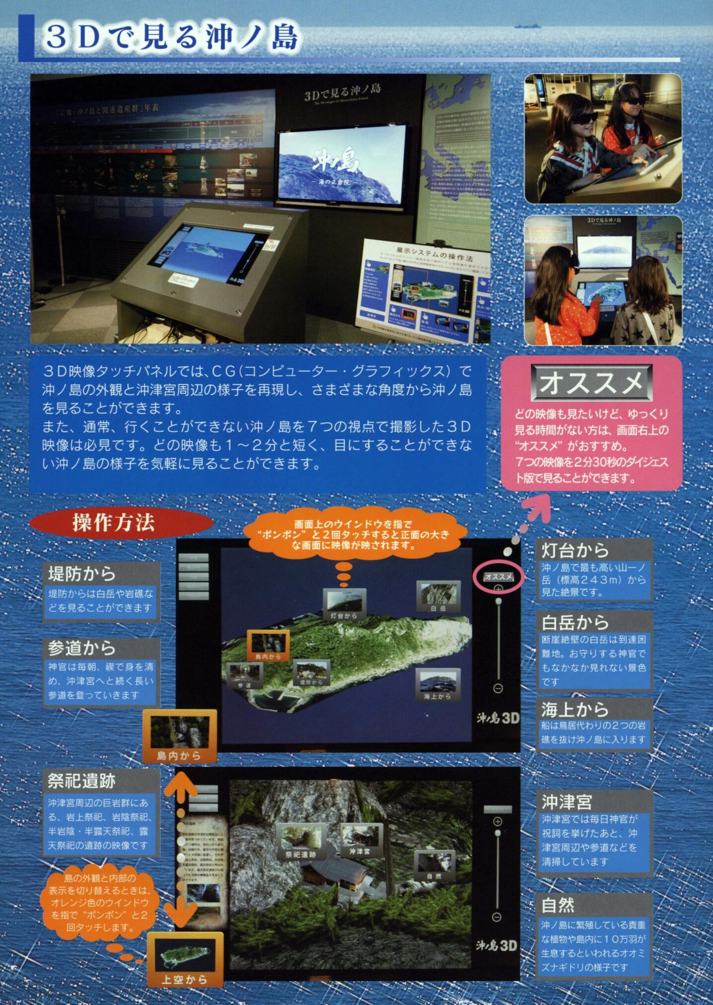 沖ノ島の祭祀場や自然環境は、巨岩や断崖、そして玄界灘の広がりによって形成される立体的で複雑な空間です。しかし、この神聖な空間に一般人が立ち入ることはできません。そのため、登録前の広報活動では「立ち入れない遺産の価値をいかに伝えるか」が最大の課題となりました。