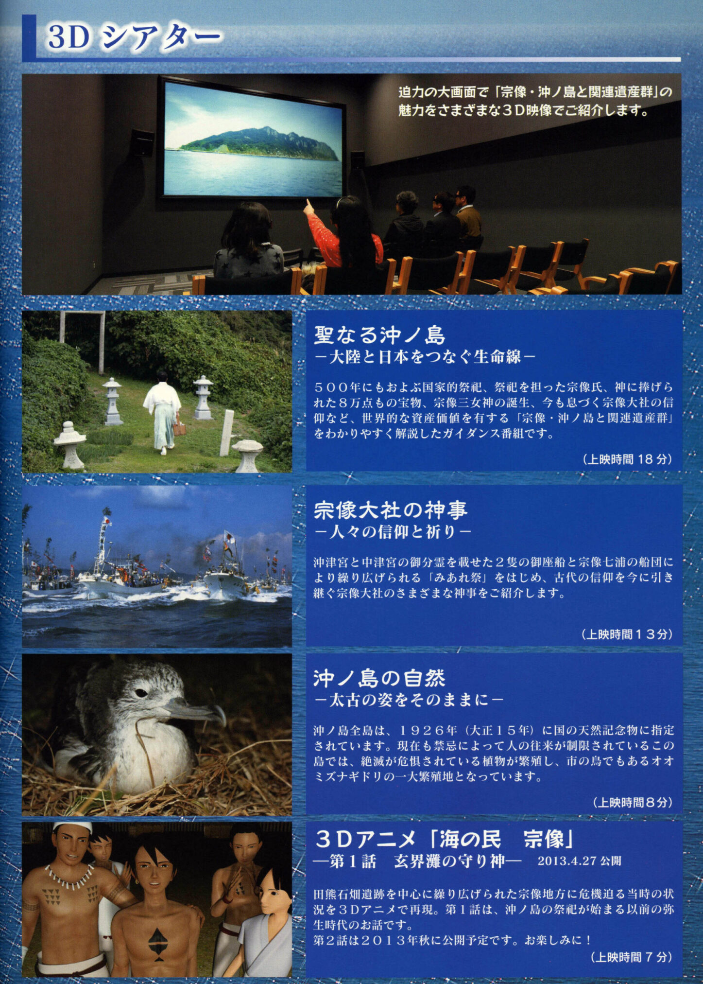 島全体がご神体であるという独特の信仰を表現するには、その「存在感」を感じさせる演出が重要です。3D映像は、岩・樹木・海といった自然要素を立体的に浮かび上がらせ、まるで鑑賞者の目の前に実在するかのような神々しさを演出します。